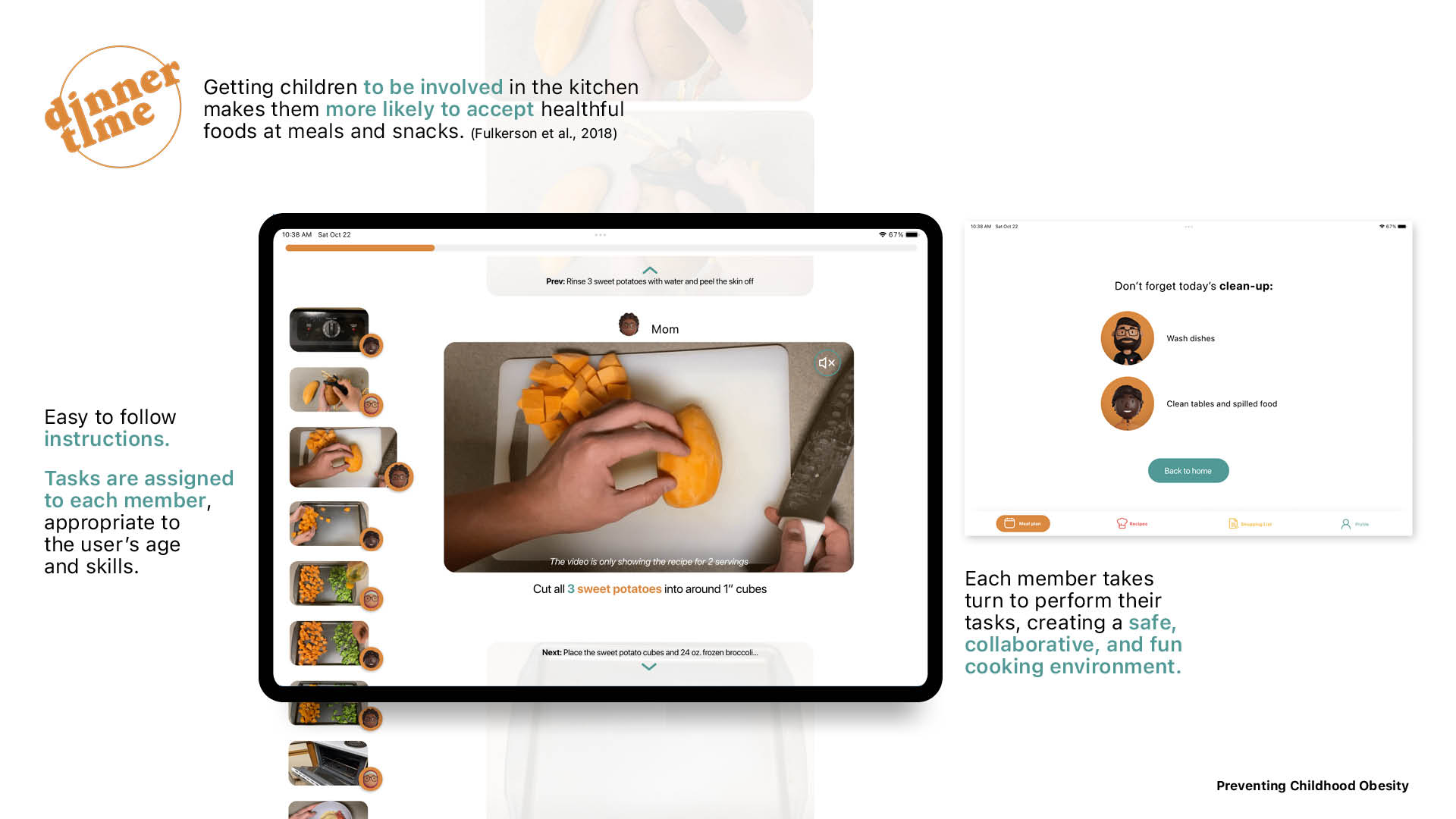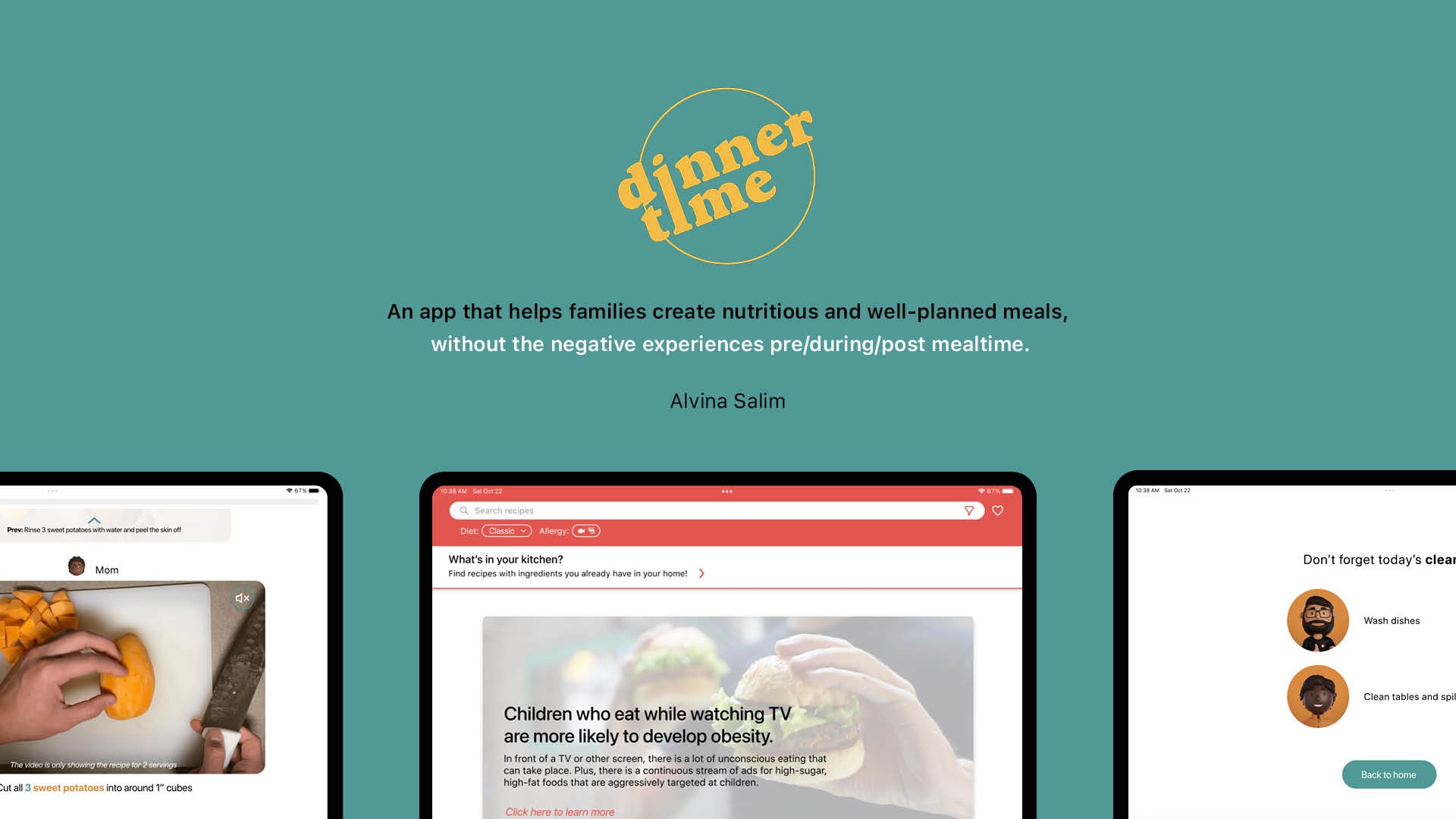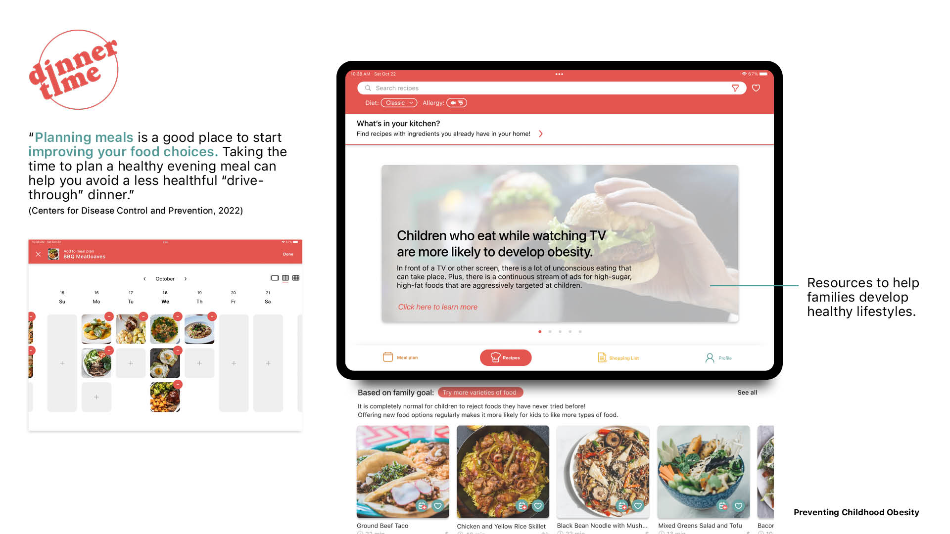A tablet app that supports frequent, meaningful family dinner time and builds lasting healthy eating habits in children. Solo project—from concept to final design. Includes qualitative research, human factors requirements, market analysis, and a design system.