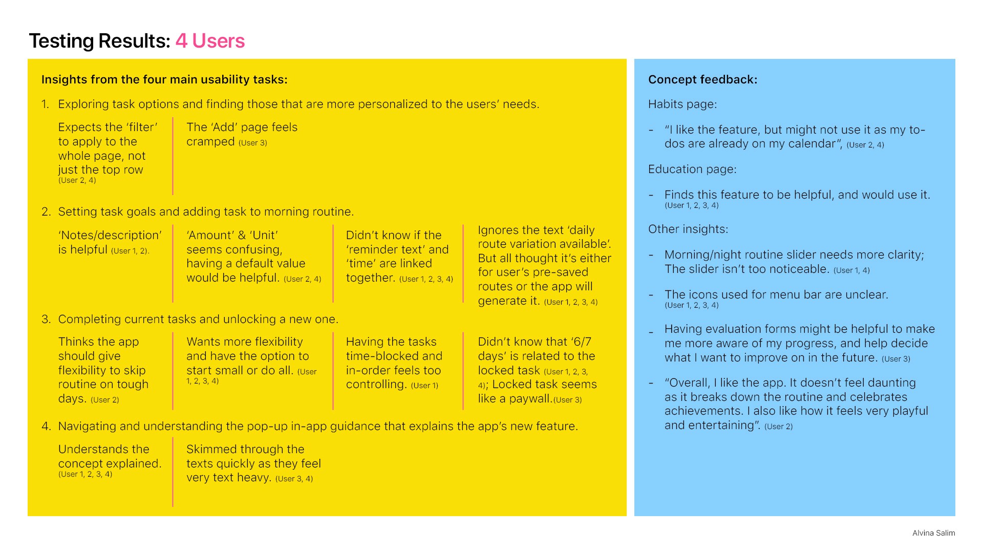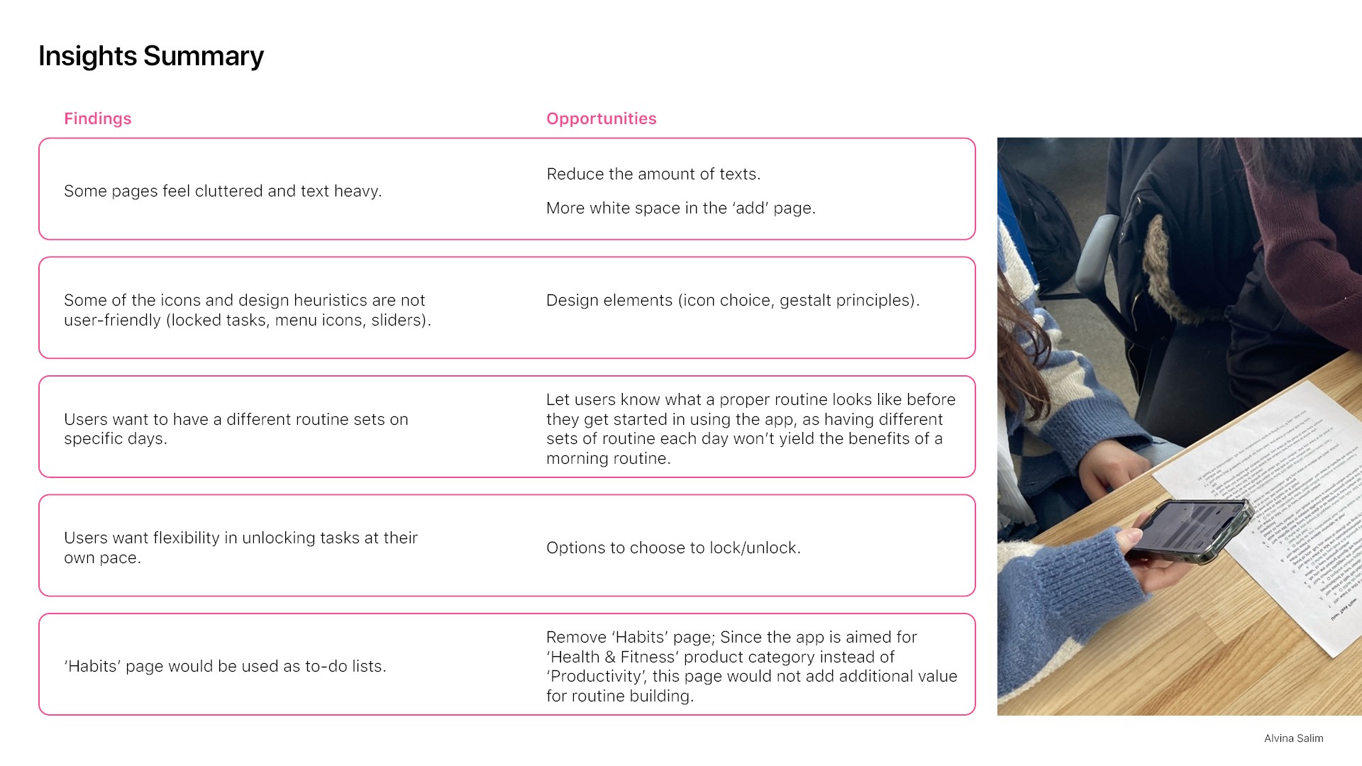 Several key insights surfaced pertaining to the app's user interface (UI) elements, the importance of including educational materials about morning routines, and the strong demand for flexibility in developing one's own routine.
