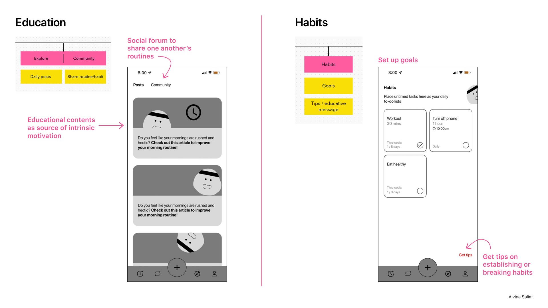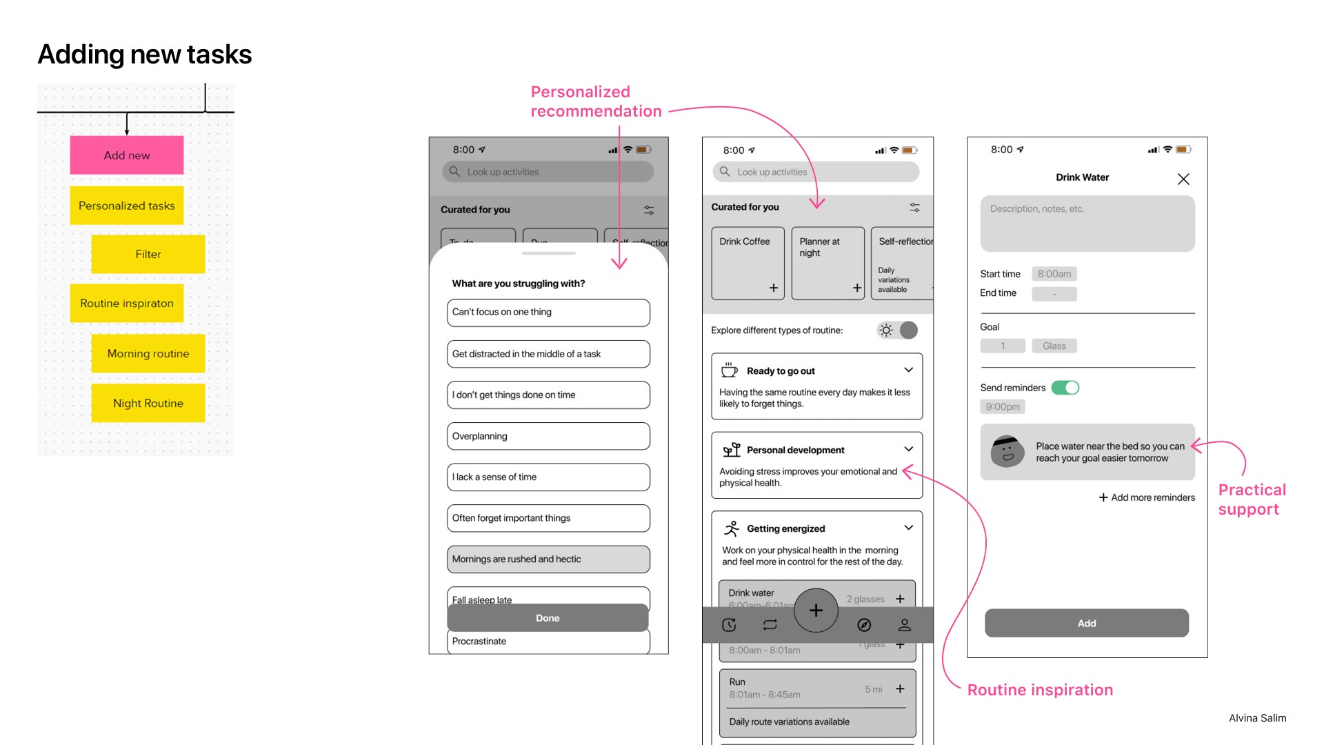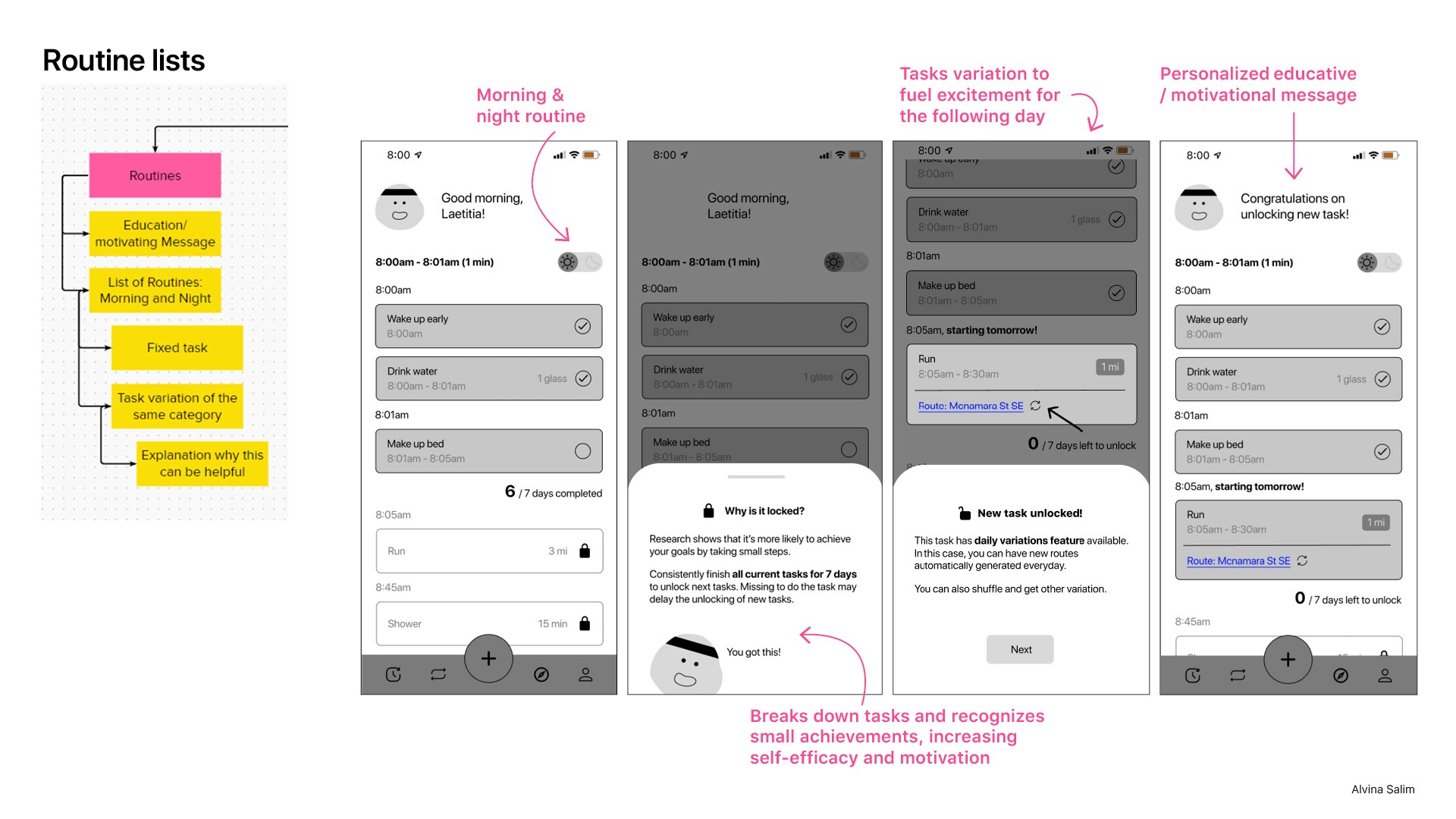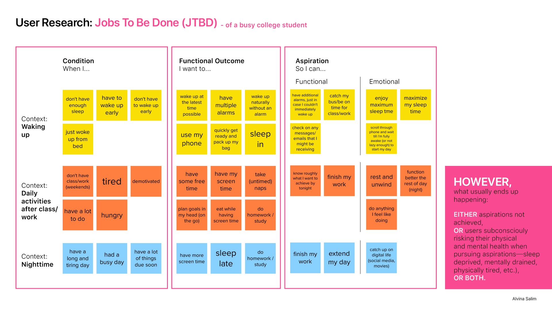 Using the Jobs To Be Done framework, I uncovered users' motivations and the underlying reasons behind their actions. I also compared their current behaviors with ideal practices for a consistent morning routine, which were informed by a thorough literature review.