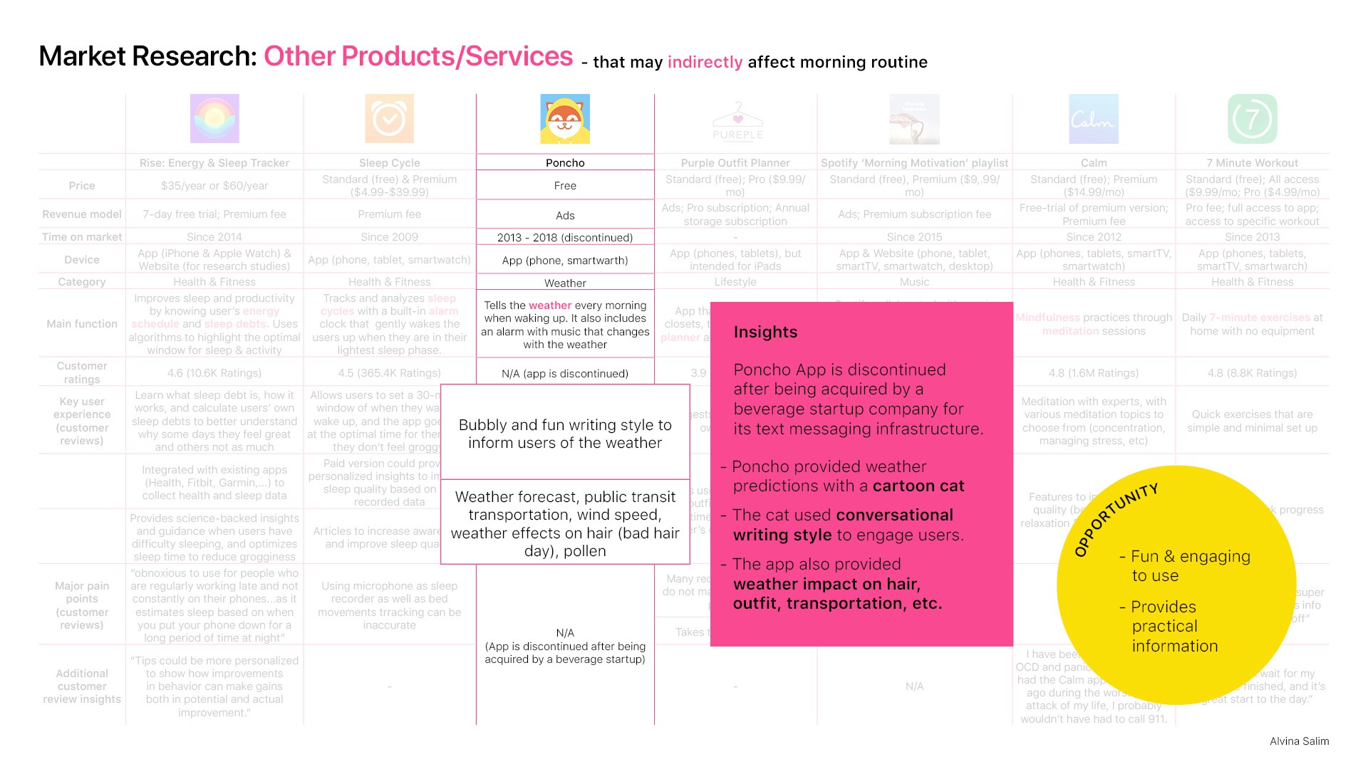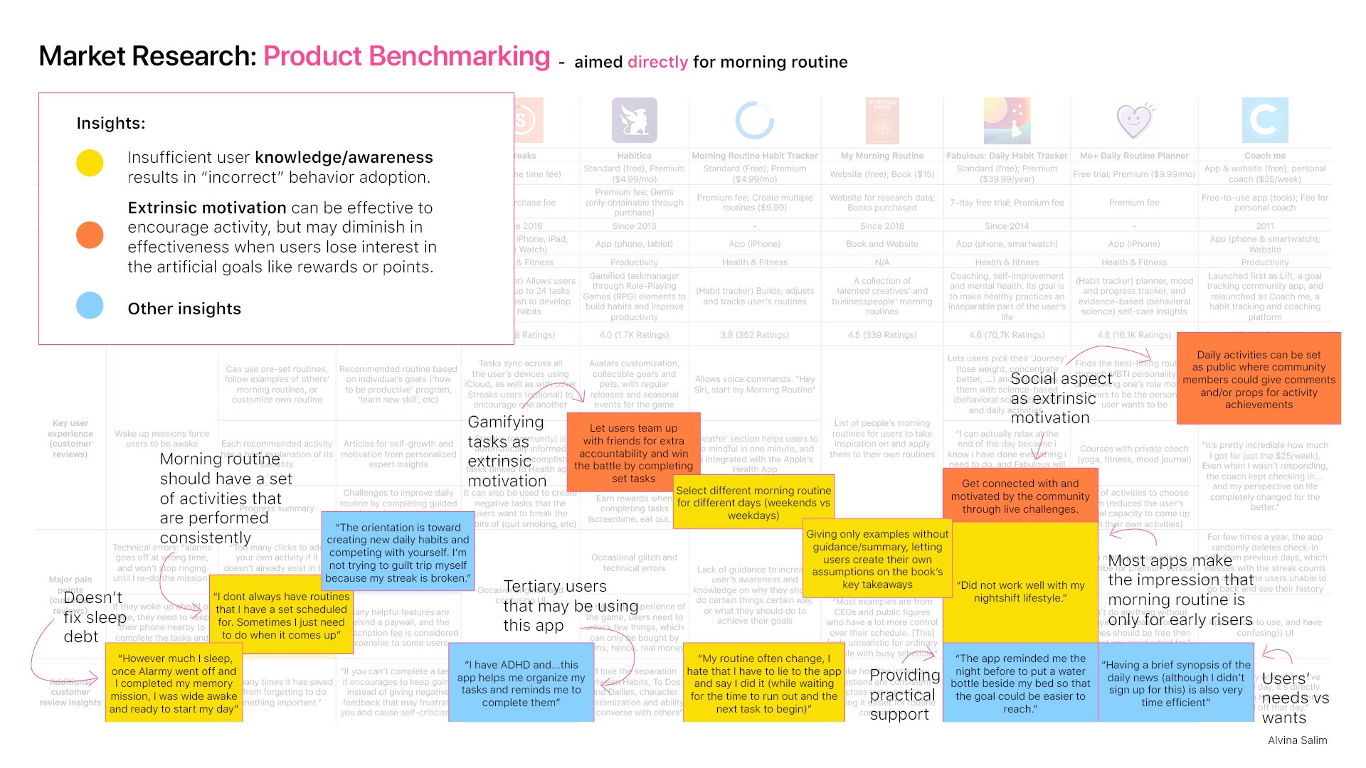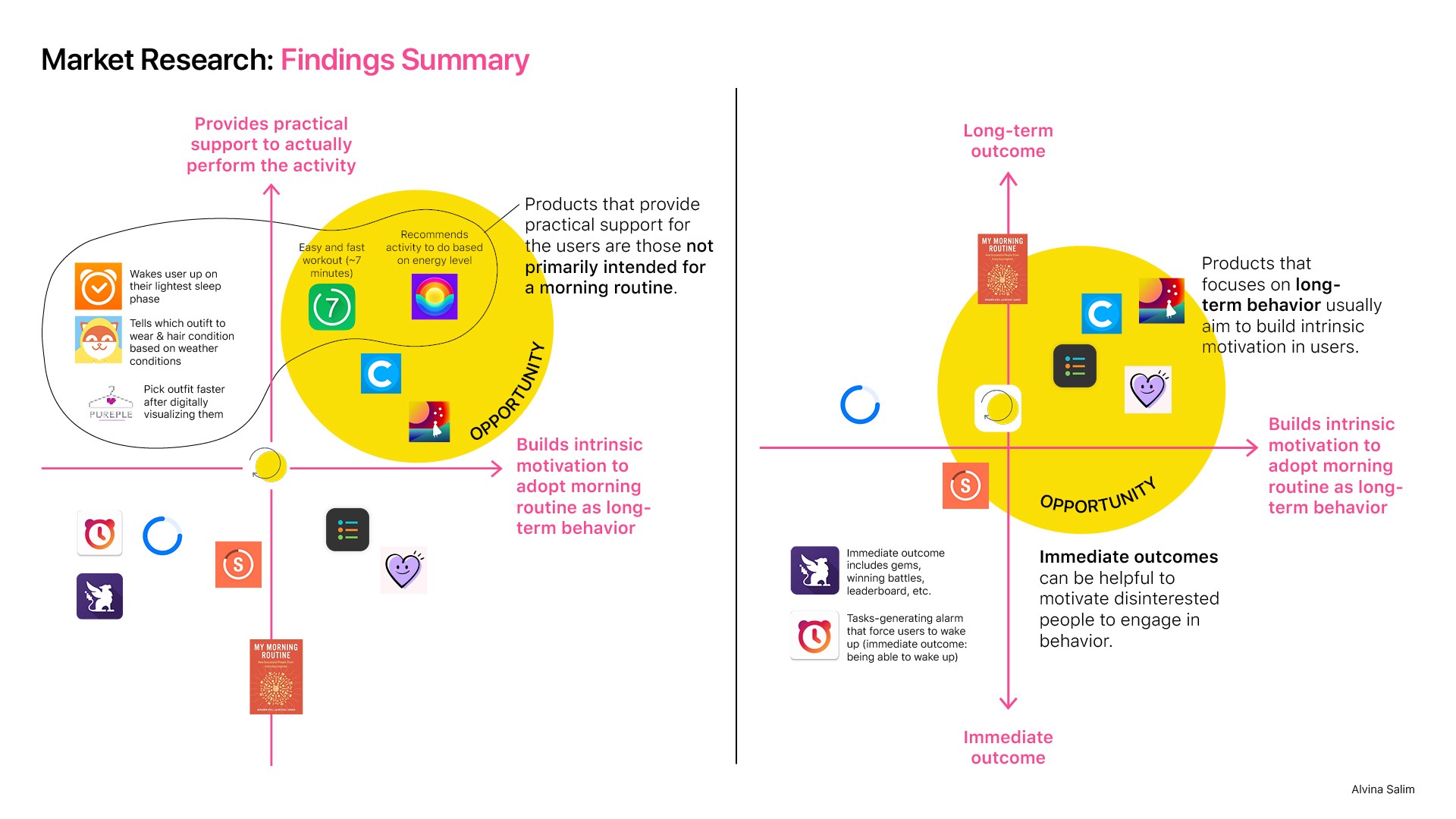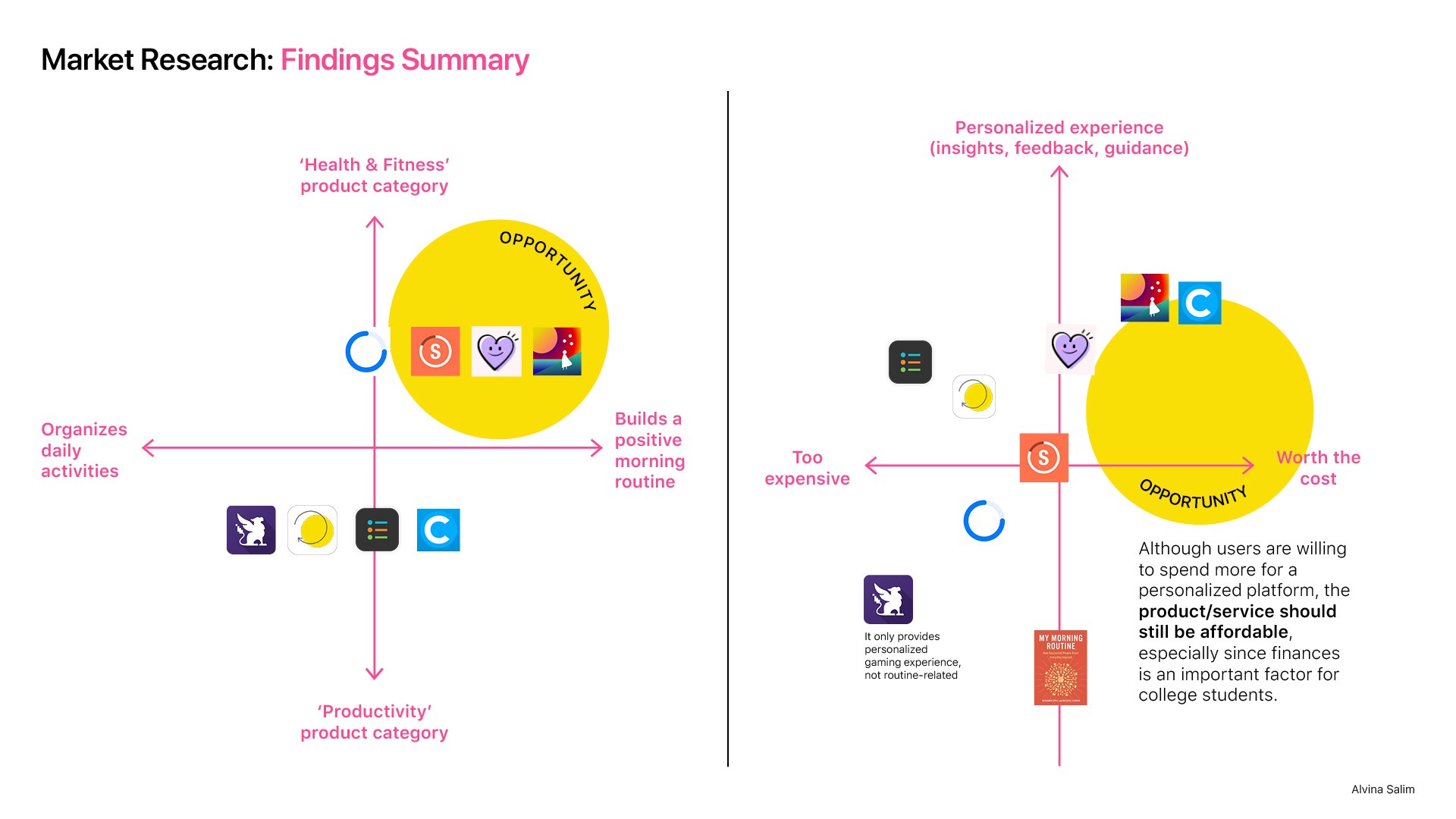 By aligning market insights with user preferences, I identified insights for the product opportunities: (1) fun and engaging, (2) offers practical information/support, (3) promotes long-term positive outcomes, and (3) targets the 'health and fitness' category rather than 'productivity', (4) creates personalized experience.