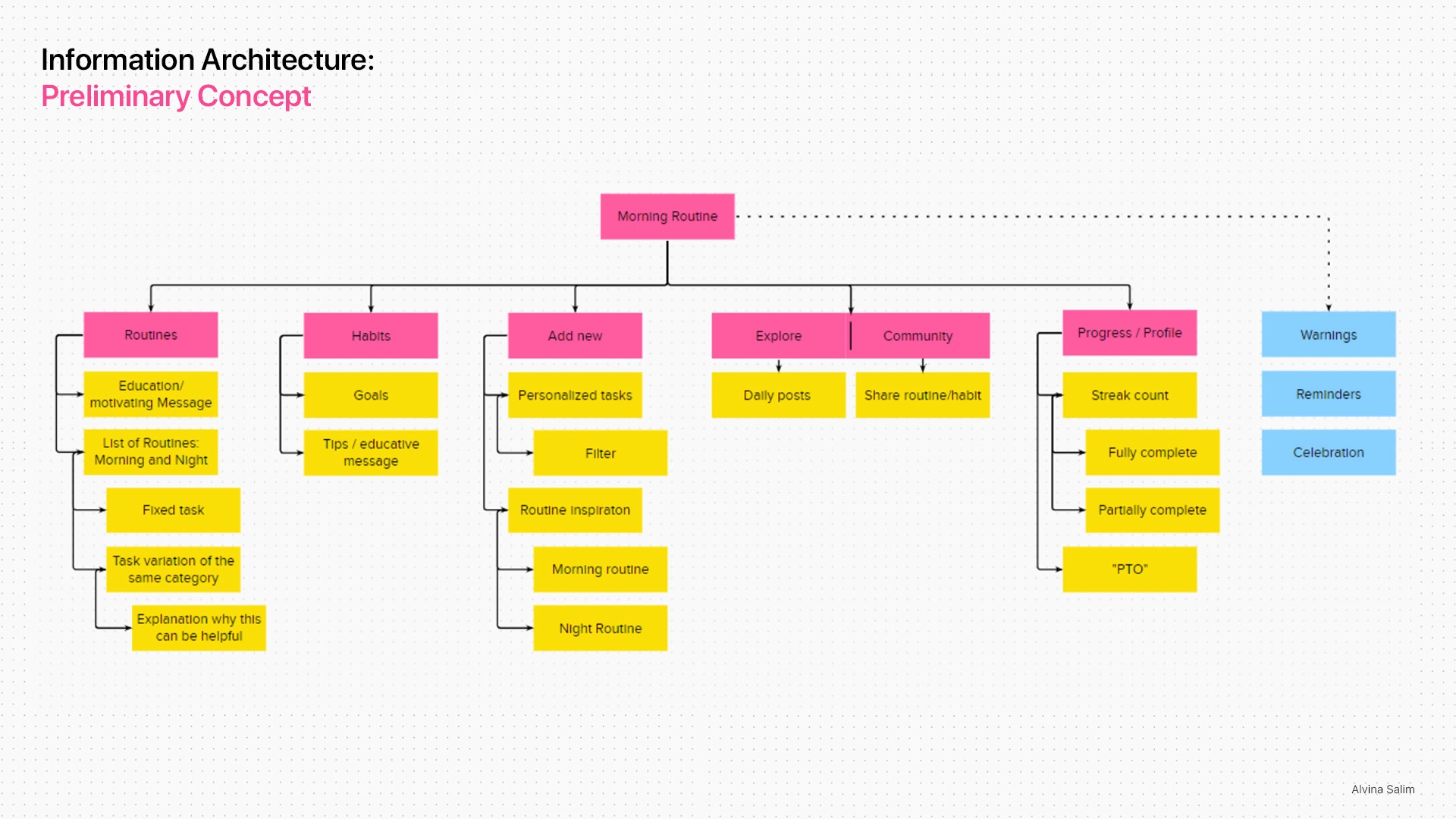 Subsequently, I categorized insights, sought peer feedback, and developed lo-fi prototypes to test the concepts. Through careful alignment with the design criteria and goals, I ultimately decided to pursue a digital product as the optimal feasible solution, and began crafting the preliminary concept for the information architecture of the product.